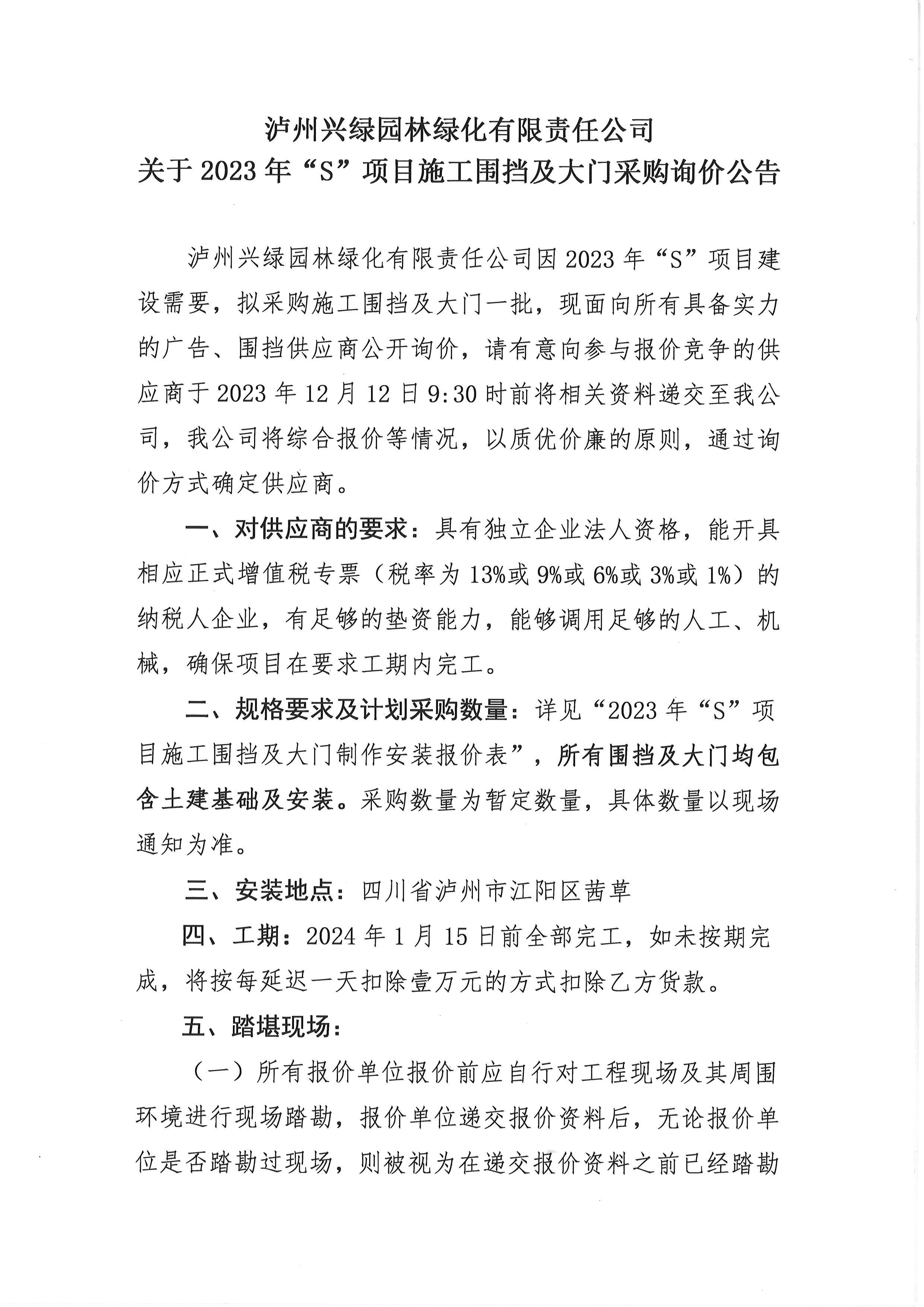 2023年“S”項目施工圍擋及大門采購詢價公告